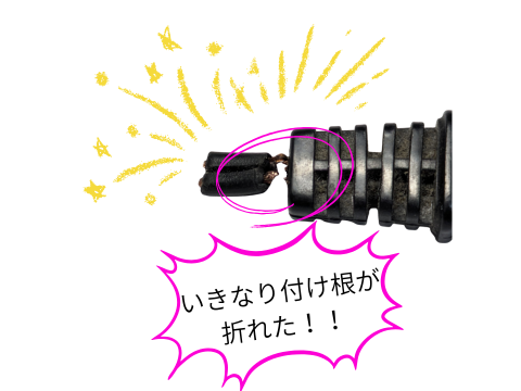 劣化していたところに、力が加わって折れてしまったということだと思われます。力が加わったと言っても、コードのほんの少し足が当たっただけだったのですが・・・よほど固くなっていたのでしょうか?