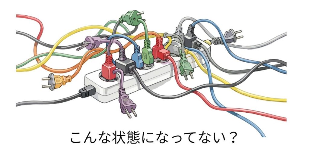 電源タップにたくさんのコンセントを差しこんでいると、線がねじれたりこんがらがった状態をそのままにしていることになります。
