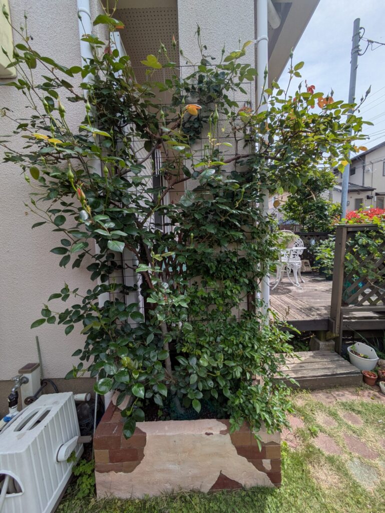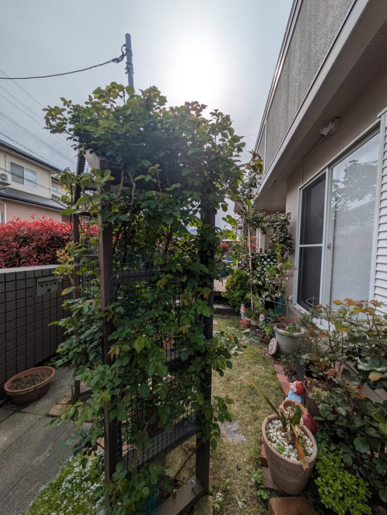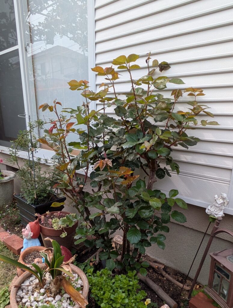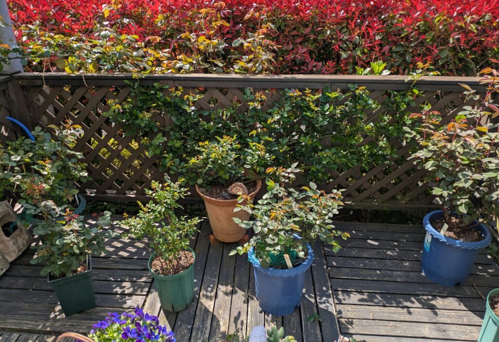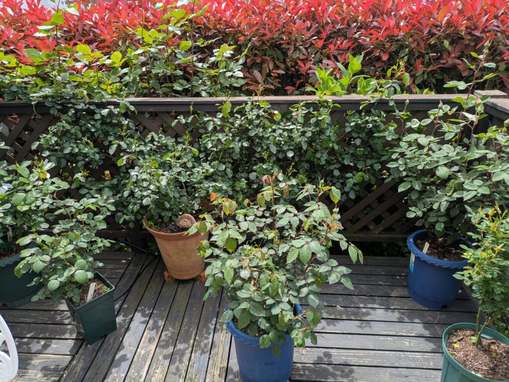 奥の素焼き鉢に入れている《ホワイトメイディランド》はいつも真っ先に黒点病を発症させますが、今の時点では問題なしです。