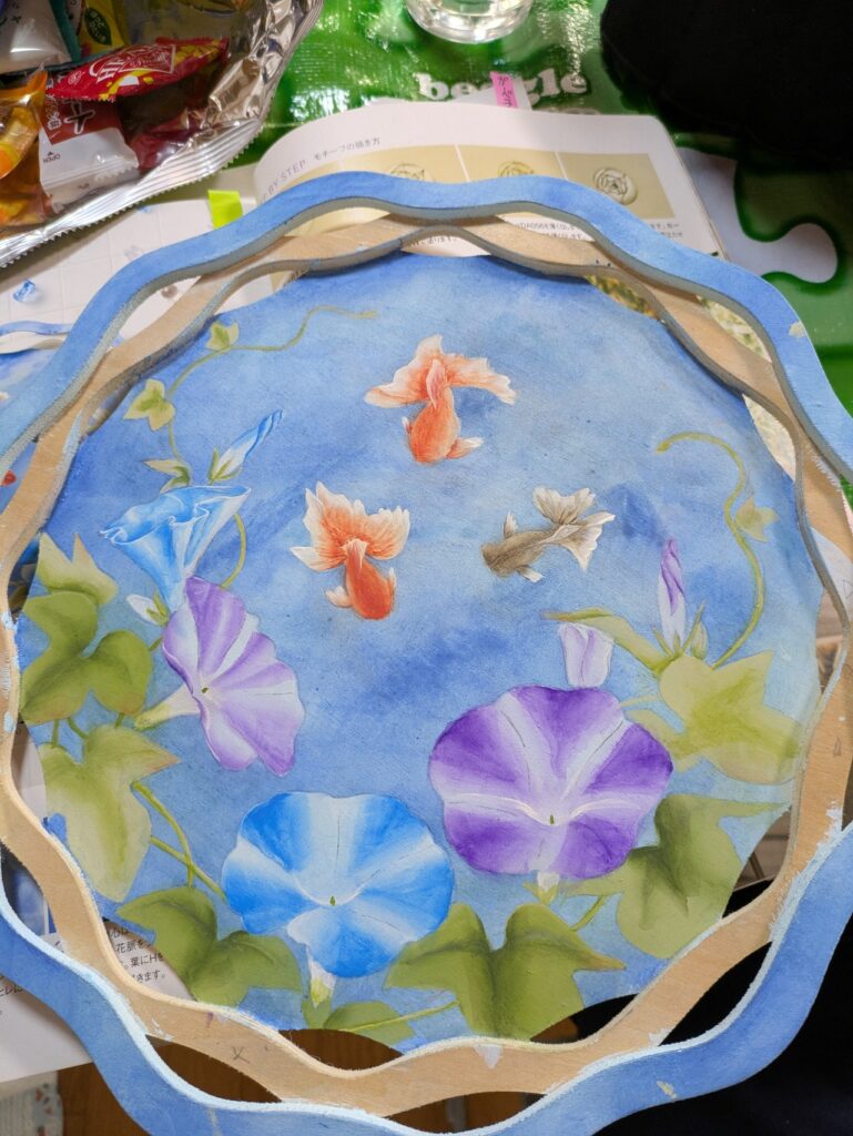 金魚が泳いでる姿と朝顔がとても涼しげな作品ですね。葉の葉脈とフレームを仕上げたら完成です。なんとか家で仕上げてくださいね!