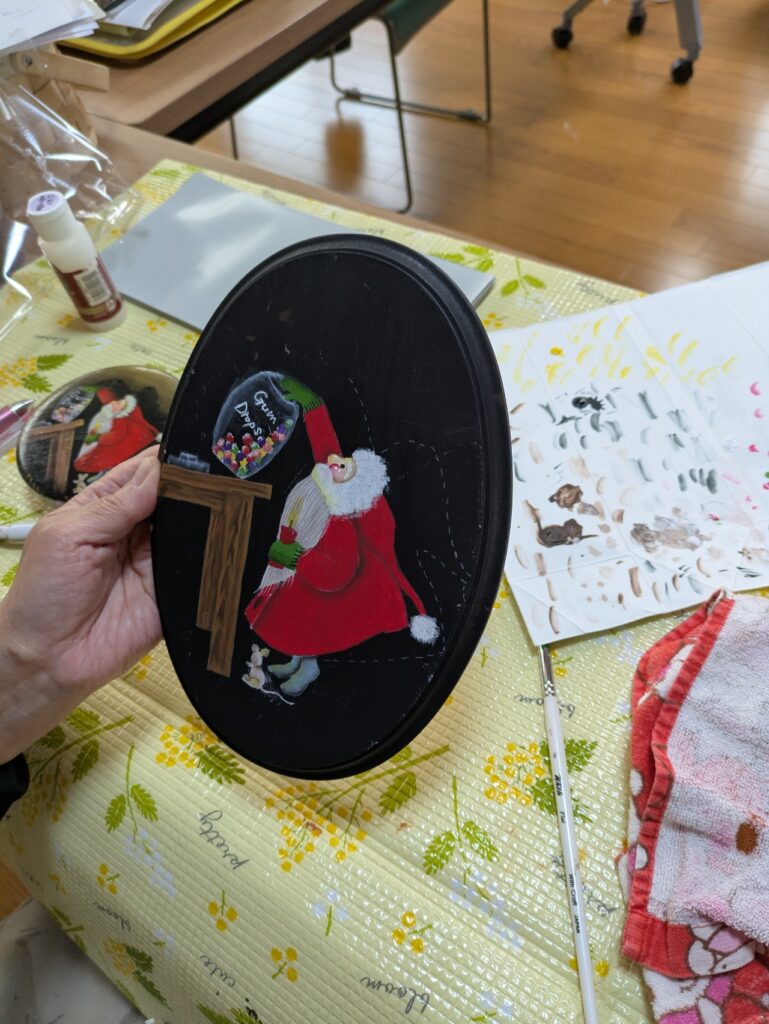 プルーディーさんのサンタを描いています。前回お休みだったので、今日は1日頑張っていただきました。 かわいいお顔のサンタさんができました。あとちょっとで完成です!!