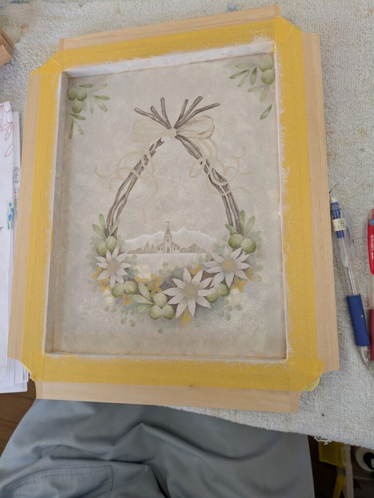 図案の転写と葉っぱのベースコートまで仕上がりました。