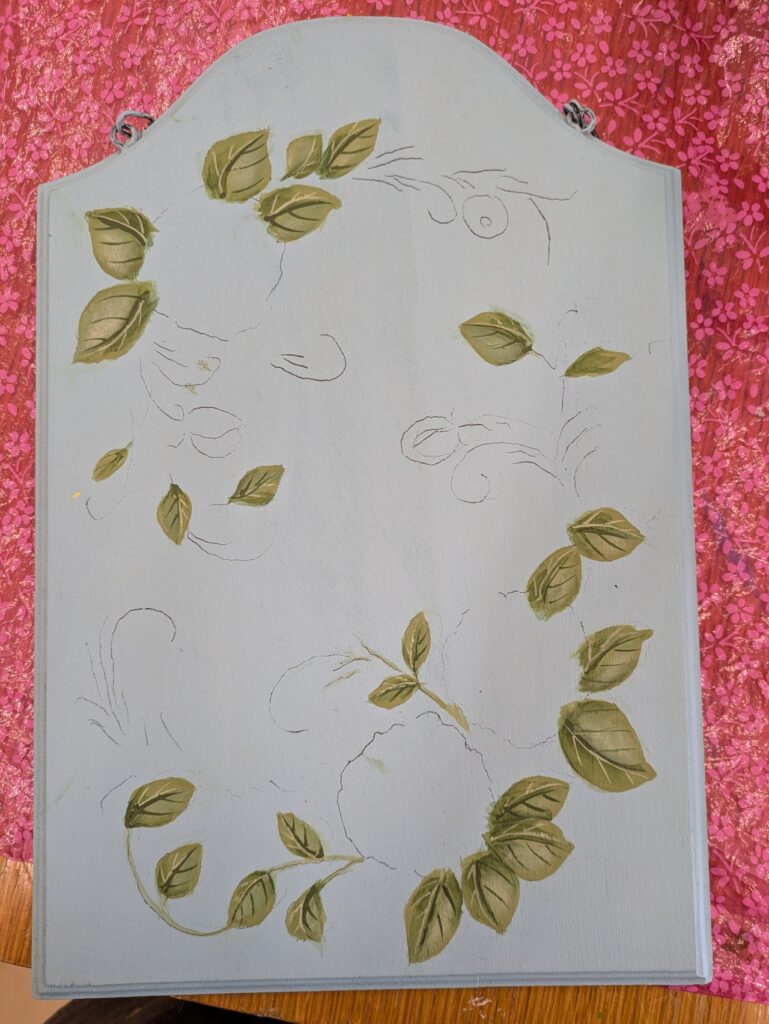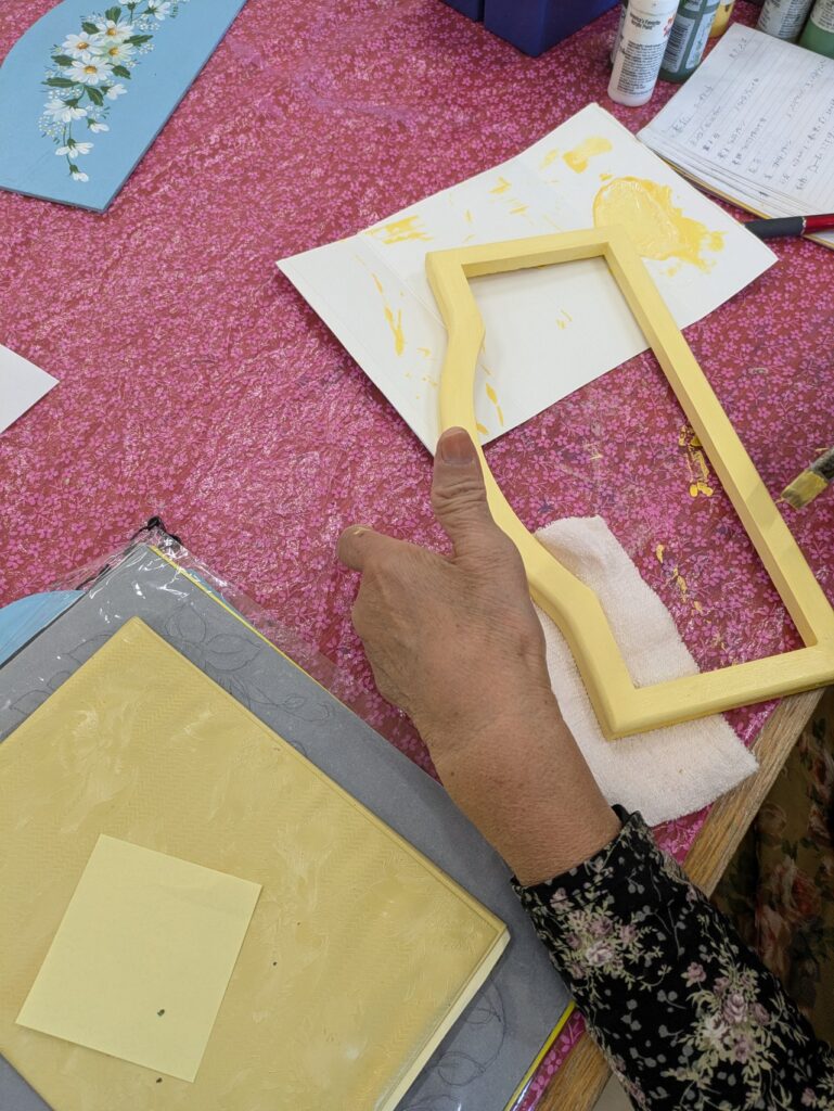 パステルイエローのフレームに塗って一つの作品が完成しました。と思ったら、その色が残ったようで、次の作品の裏面を塗っていました。以前から裏面(時々表面も)が全く違う背景の色がのっていることがありましたが、どうやら絵具の残りがあると、あちこちに色をのせるようです。