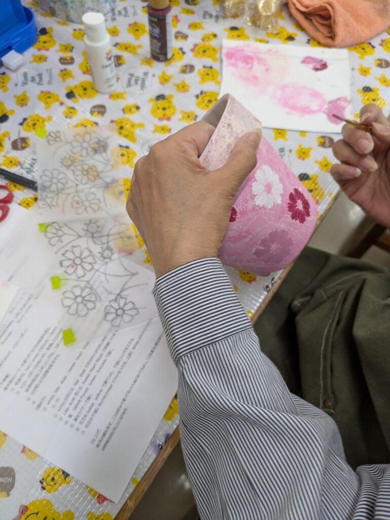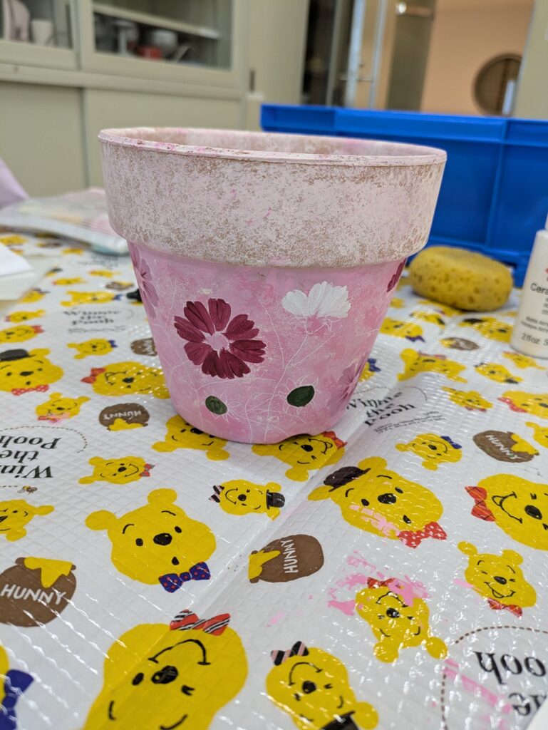 素焼きの植木鉢にお好みの色をのせてコスモスを描いていきます。ピンクがかわいいですね。