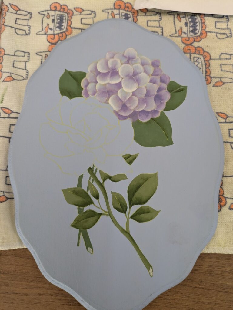 アジサイは球体なので、影のできるところとハイライトの所を薄くグレーズして色を重ねていくと少し楽になりますね。