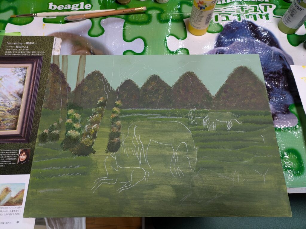 アートクラフト掲載の稲田伸代先生デザインの風景画を描いています。