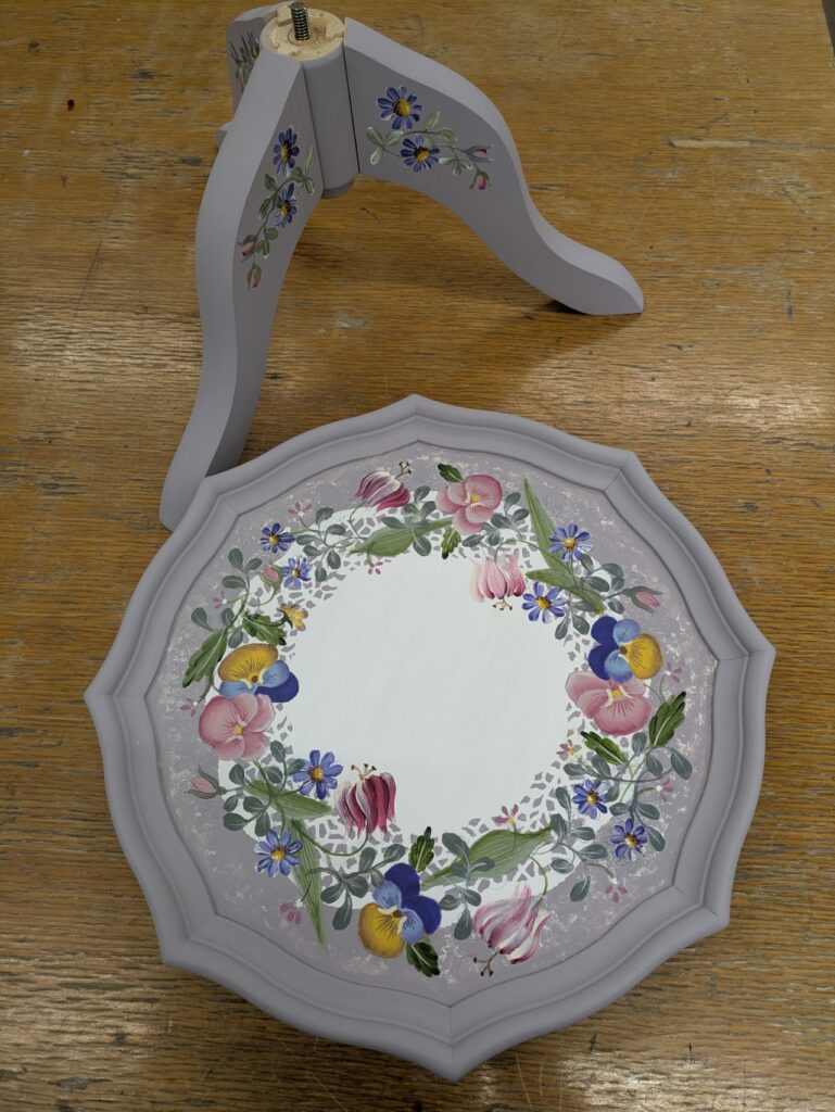 ワインテーブルに花をたくさん描きました。テーブルの脚の部分をどう塗り分けるか?