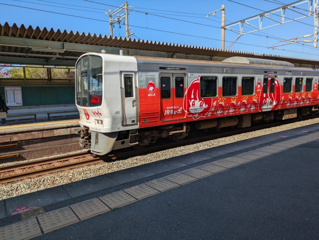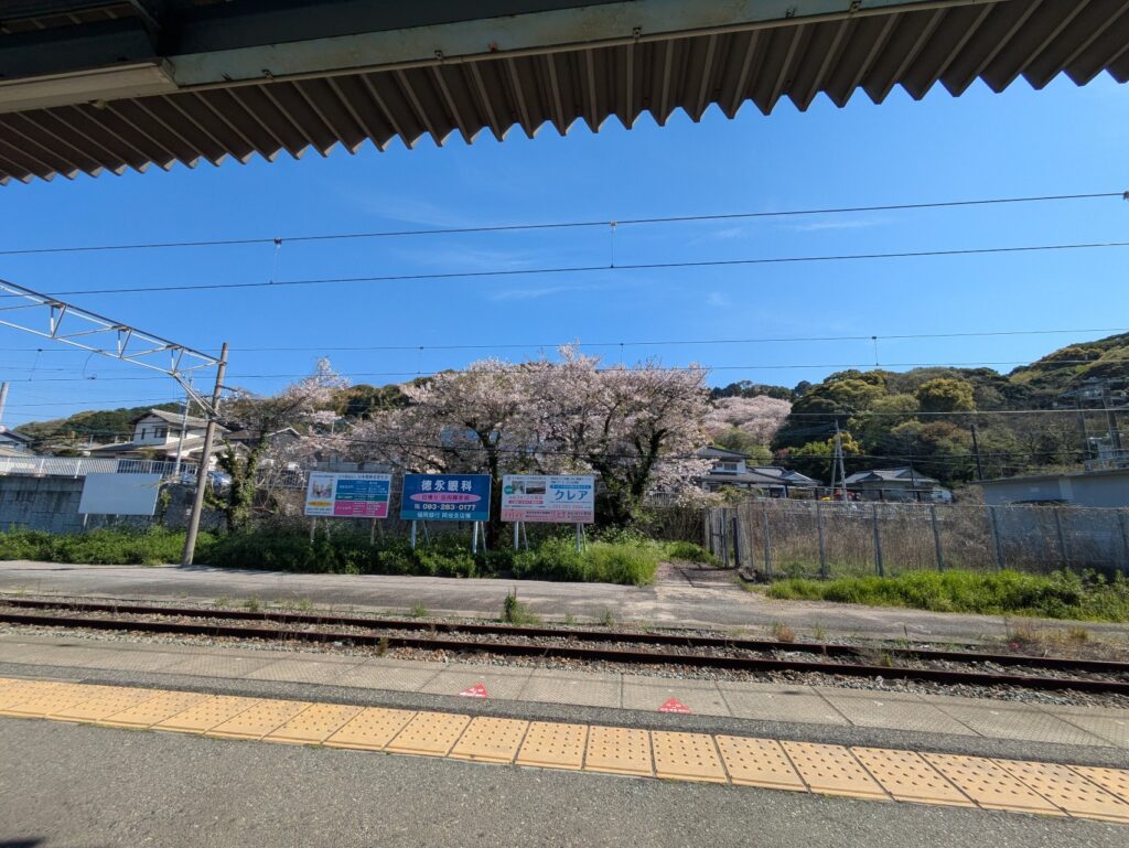 久々のJR。ラッピング列車でポップな車両も私にとっては珍しい。駅のホームも桜が満開!