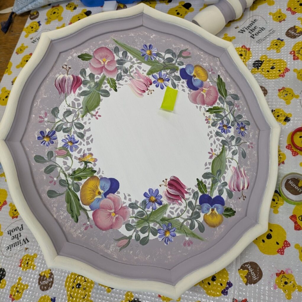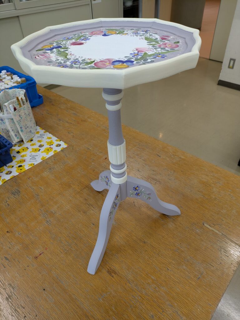 テーブルの脚の部分の色の塗り分けは前回相談して決めていたので、家でしっかり塗ってこられました。それに合わせて天板の色も少し塗り分けた方がいいよね、と言うことで一番外側の部分に色を塗っていただきました。