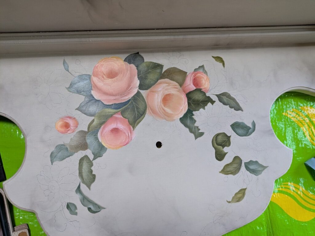 大きなシェルフにメアリージョーレイジャー風の薔薇を描いています。