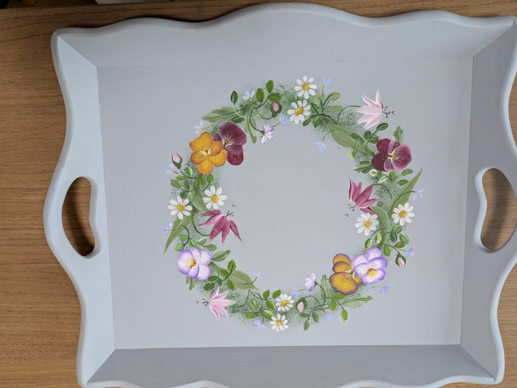 ワインテーブル用の図案を大きなトレイに描いています。